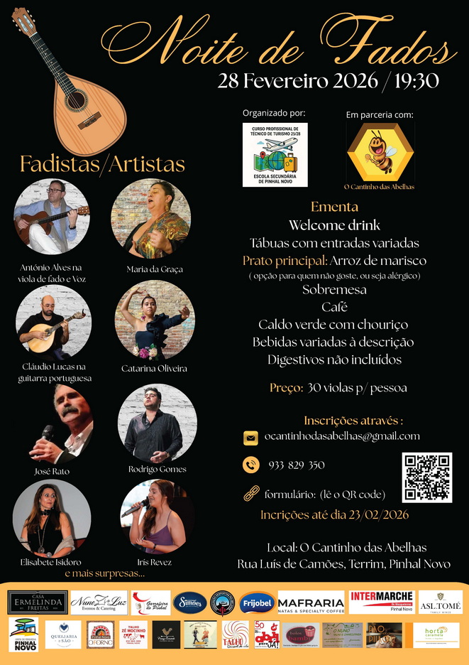 O Curso Profissional de Técnico de Turismo da Escola Secundária de Pinhal Novo tem o prazer de convidar V. Ex.as para a nossa Noite de Fados, um projeto dirigido a toda a comunidade educativa, a realizar-se em parceria com o Espaço O Cantinho das Abelhas (Terrim, Pinhal Novo).