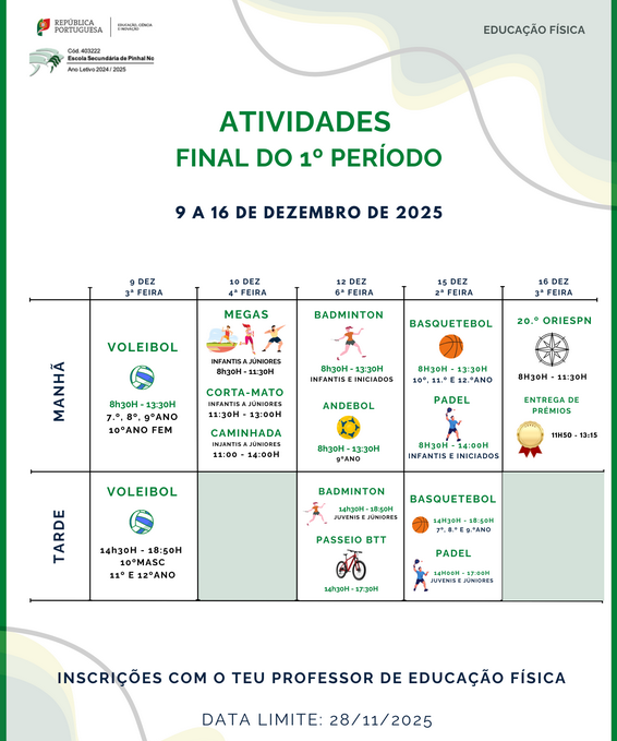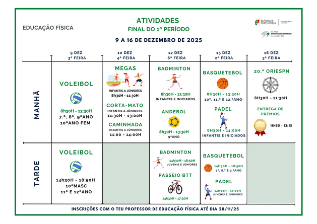 As inscrições devem ser efetuadas com o vosso professor de Educação Física, até dia 28 de novembro, sexta-feira.